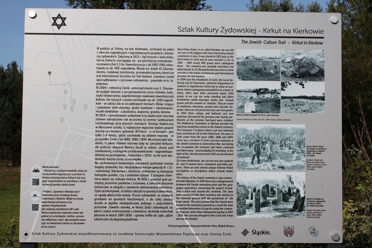 In August 2014, work on the assembly of unique cast-iron matzevot in the Jewish cemetery was completed. Wojciech Mszyca, an enthusiast of the history of Żarek, and the Żarki Commune under the patronage of the Mayor of Żarki and the Commune of Żarki, Klemens Podlejski, were involved in the work. Matzevot were accidentally found in 2013 in the area of the Leśniów Sanctuary in Żarki during earthworks. They were taken to the Cultural Center (former synagogue) in Żarki.